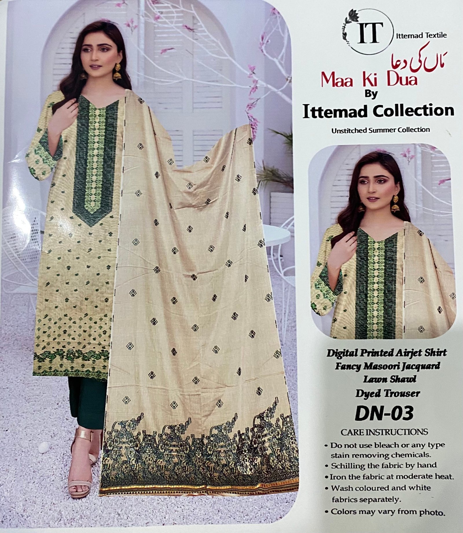 Step into summer with this elegant three‑piece unstitched lawn suit in soothing beige and vibrant green. The lightweight Airjet shirt showcases a striking central green digital print framed by delicate scattered motifs, while its sleeves echo the same intricate design. A matching cream‑beige Masoori jacquard shawl, dotted with tiny prints and finished with a bold green‑bordered hem, adds a touch of refinement. The ensemble is completed by soft, breathable green trousers that tie the look together. Perfect for daytime gatherings or relaxed evenings, this suit blends comfort and sophistication for a standout seasonal statement.