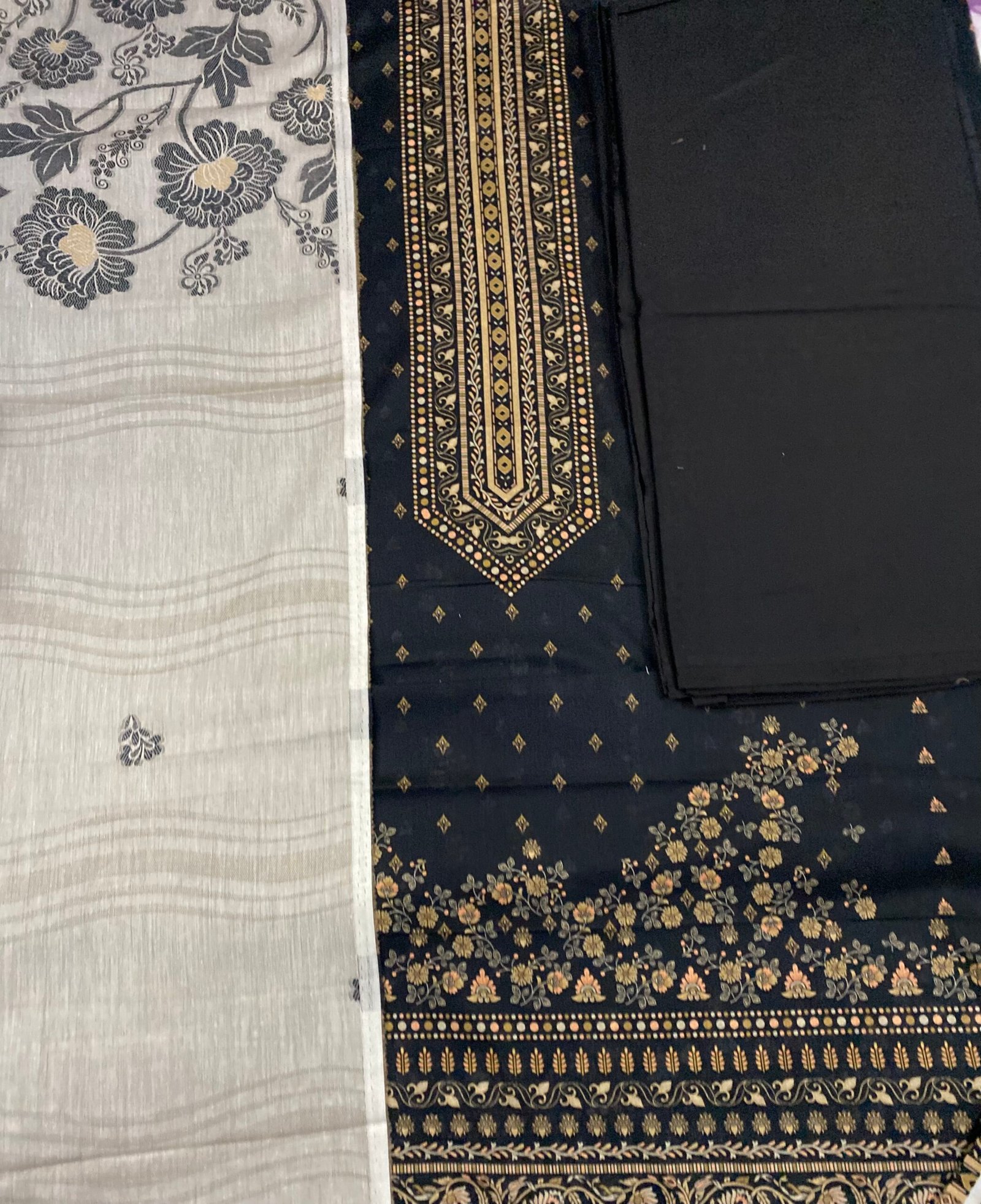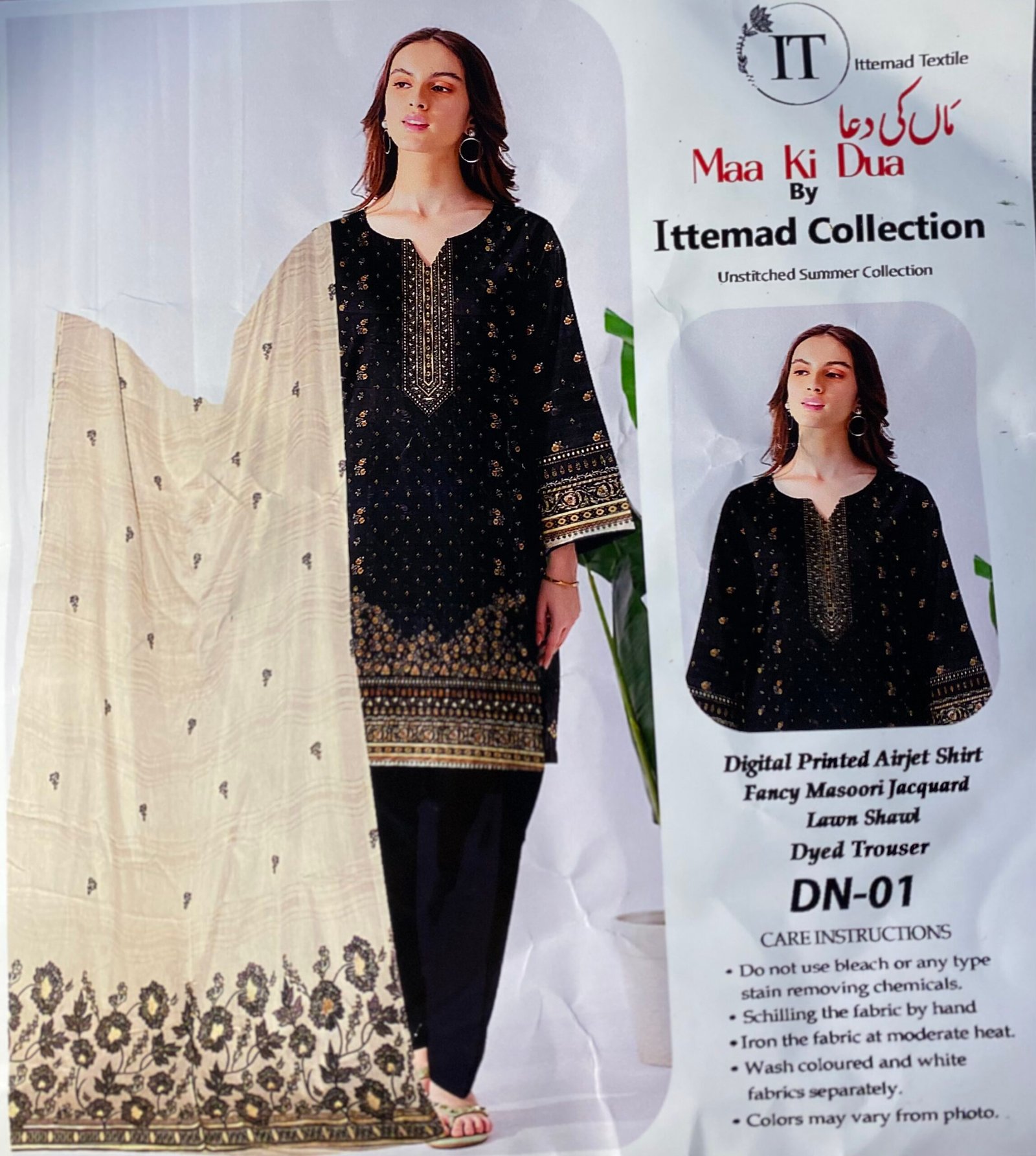 This graceful 3-piece unstitched ensemble from the Ittemad Collection features a digitally printed Airjet shirt in classic black with intricate gold detailing. It is paired with a luxurious cream Fancy Masoori Jacquard shawl and solid dyed trousers. Ideal for both festive and semi-formal wear, the breathable lawn fabric ensures comfort without compromising on style.
